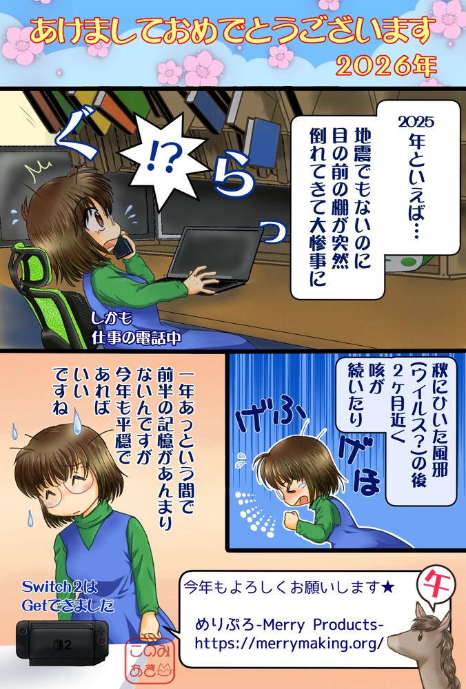 漫筆 2026.01.01 2026年 2026年 あけましておめでとうございます。 今年もどうぞよろしくお願いいたします! 目次: 2026年の年賀状ですが、やはり投函が遅れております……。 いやー、ほんと、一年の前半の記憶があまり残ってなくて困ったものです。 今年はちゃんと生きられたら良いなぁ。